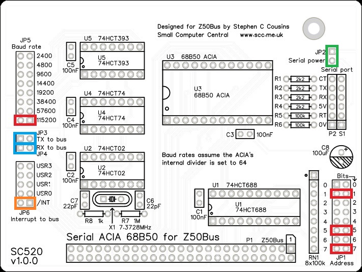 Software should set the ACIA’s internal divider to 64. This will generate the indicated baud rates from a 7.3728 MHz oscillator. It is best to set the software to assume 115200 baud, regardless of the jumper setting, as selecting a slow baud rate in software may result in the ACIA’s internal devider being set to a value other than 64.