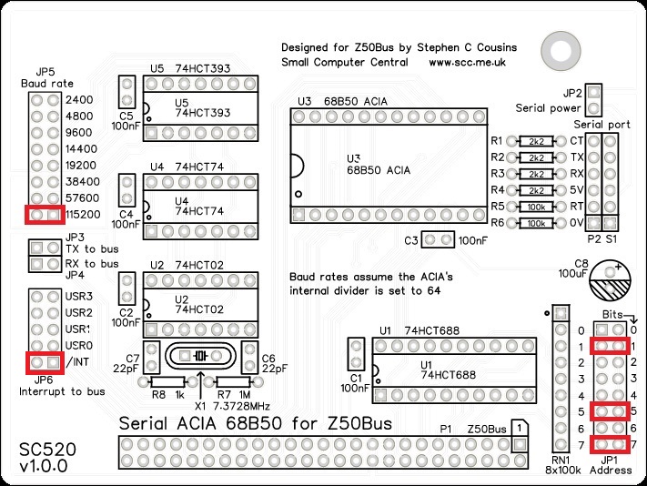 As this card has its own non-programmable baud rate generator the baud rate settings in software, such as RomWBW and SCM, are ignored. Software should be set to 115200 baud regardless of the jumper shunt position on this card. See technical note below.